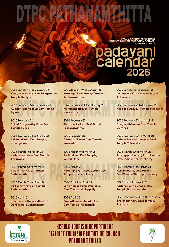Pathanamthitta, Kerala – The Pathanamthitta District Tourism Promotion Council (DTPC) and the district administration have jointly prepared and released a detailed Padayani Calendar for 2026, offering a comprehensive guide to one of Kerala’s most vibrant and ancient folk ritual art forms.